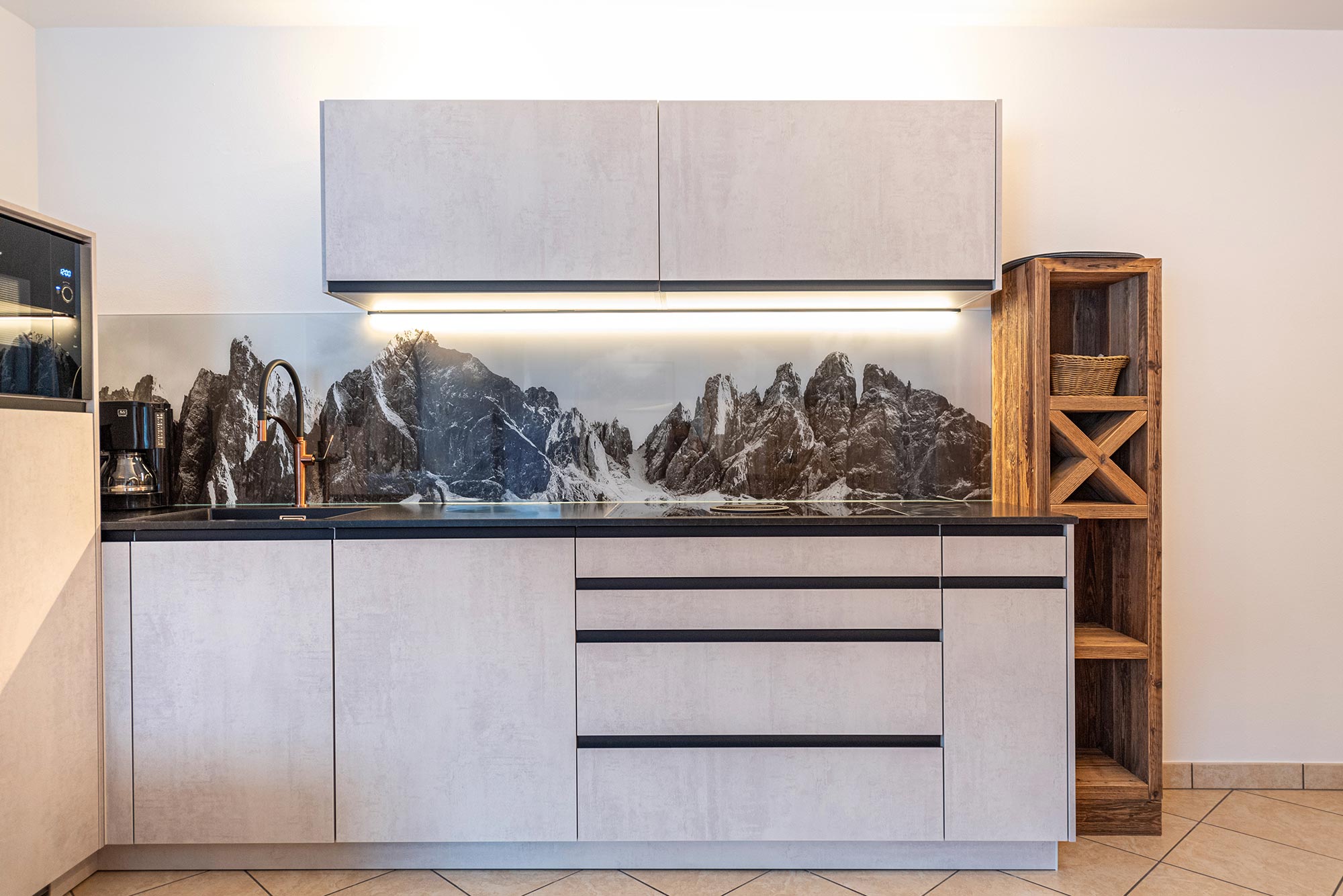 Küchenecke mit Mikrowelle, Spülmaschine, elektrische Kochplatte und Sat/TV,